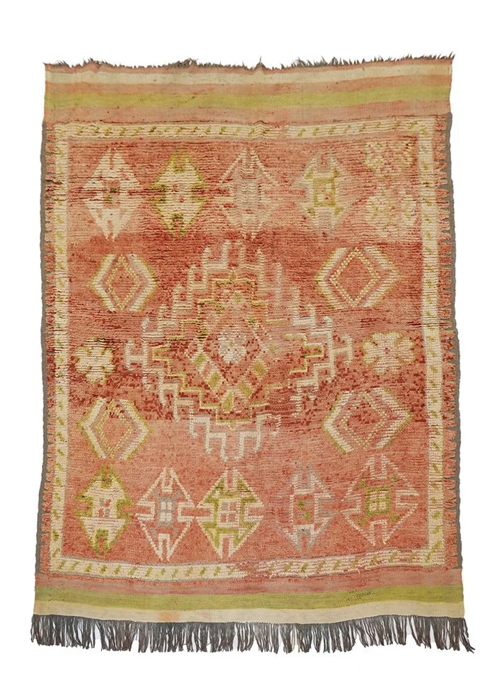 Handwoven by skilled artisans from the Beni Mrirt tribe in the Middle Atlas Mountains of Morocco, this vintage rug showcases a timeless blend of tradition and character. Crafted from natural wool with soft, earthy tones and abstract geometric patterns. The slightly faded, worn-in look adds a layer of authenticity and charm, making each piece truly one of a kind.
